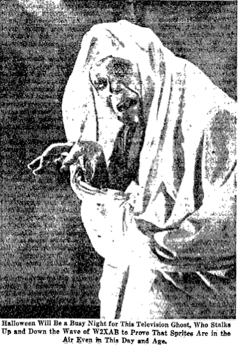 The Television Ghost, considered one of TV’s first dramatic series (1931-1933), belongs to the spectral repository of lost media. Since television technology was in its infancy, the transmission projected a single static image—that of the “Ghost” draped in a white sheet, face painted white, mouth tubercular black. Interestingly, the show’s premise revolved around the ghosts of murder victims recalling how they met their untimely demise (and viewers left to deduce who the killers were), while the show itself became the victim to Time’s merciless erasure (with no surviving footage), and also the medium to its own séance, attempting to conjure evidence which testifies to its vanished life and place in the world of floating images.